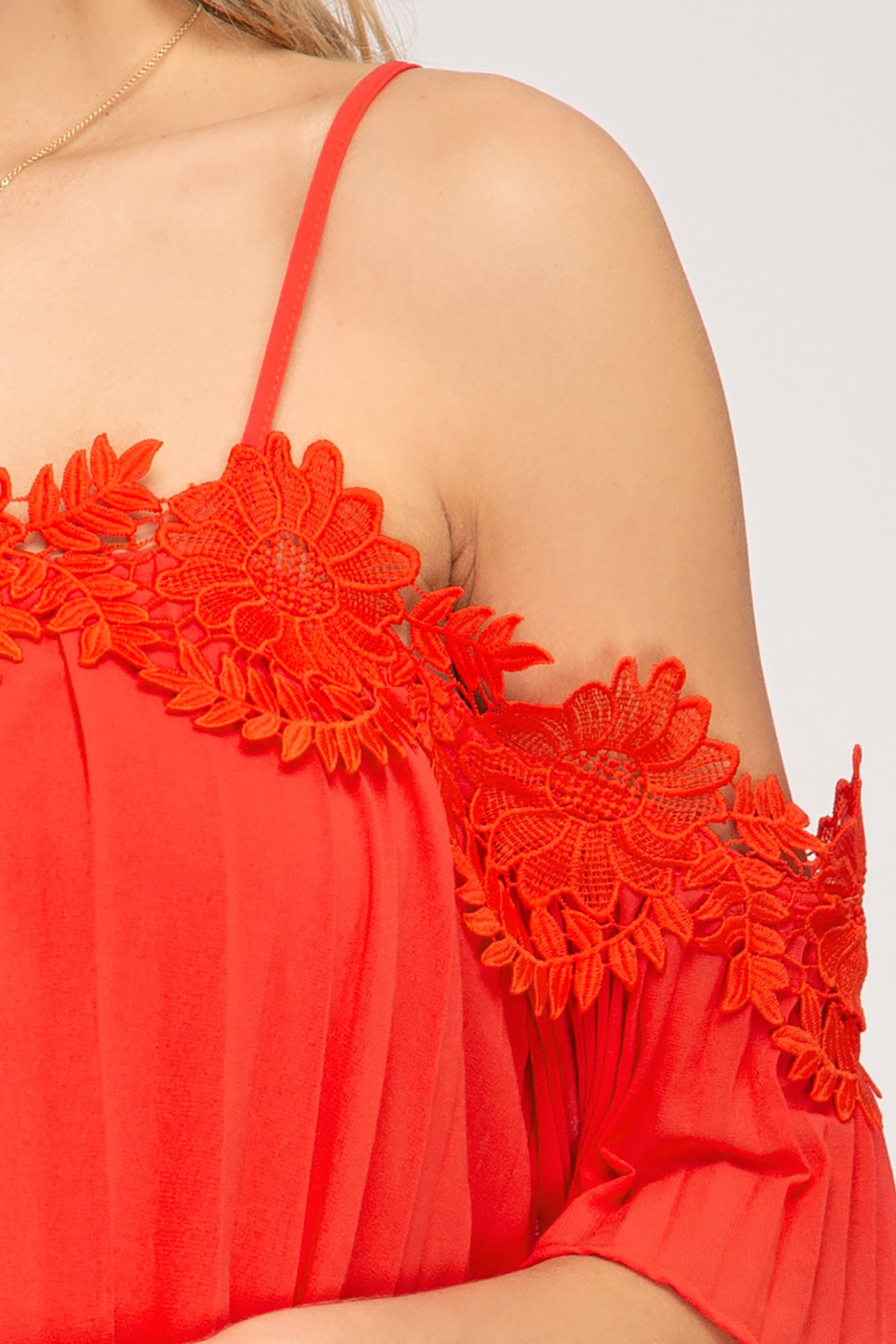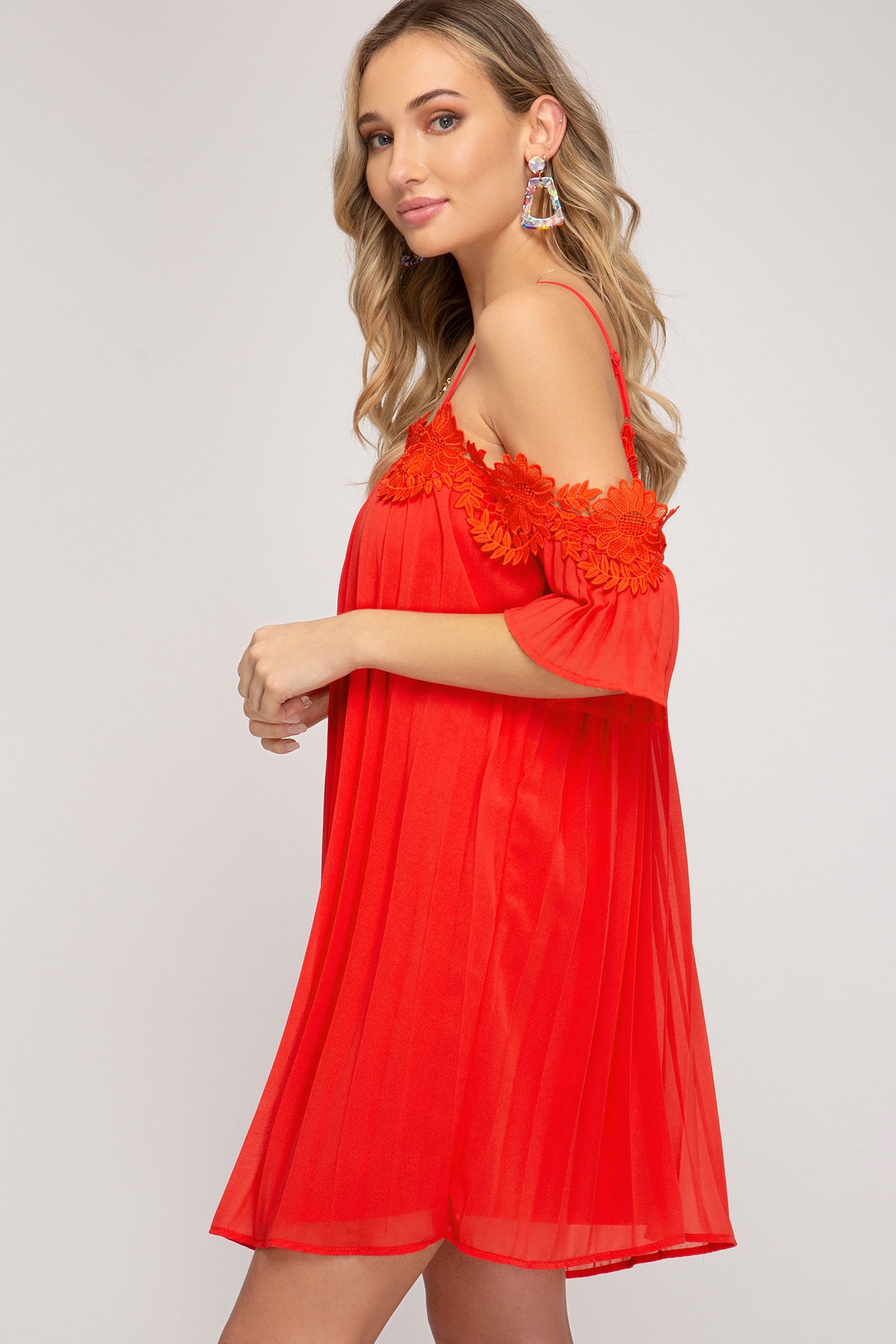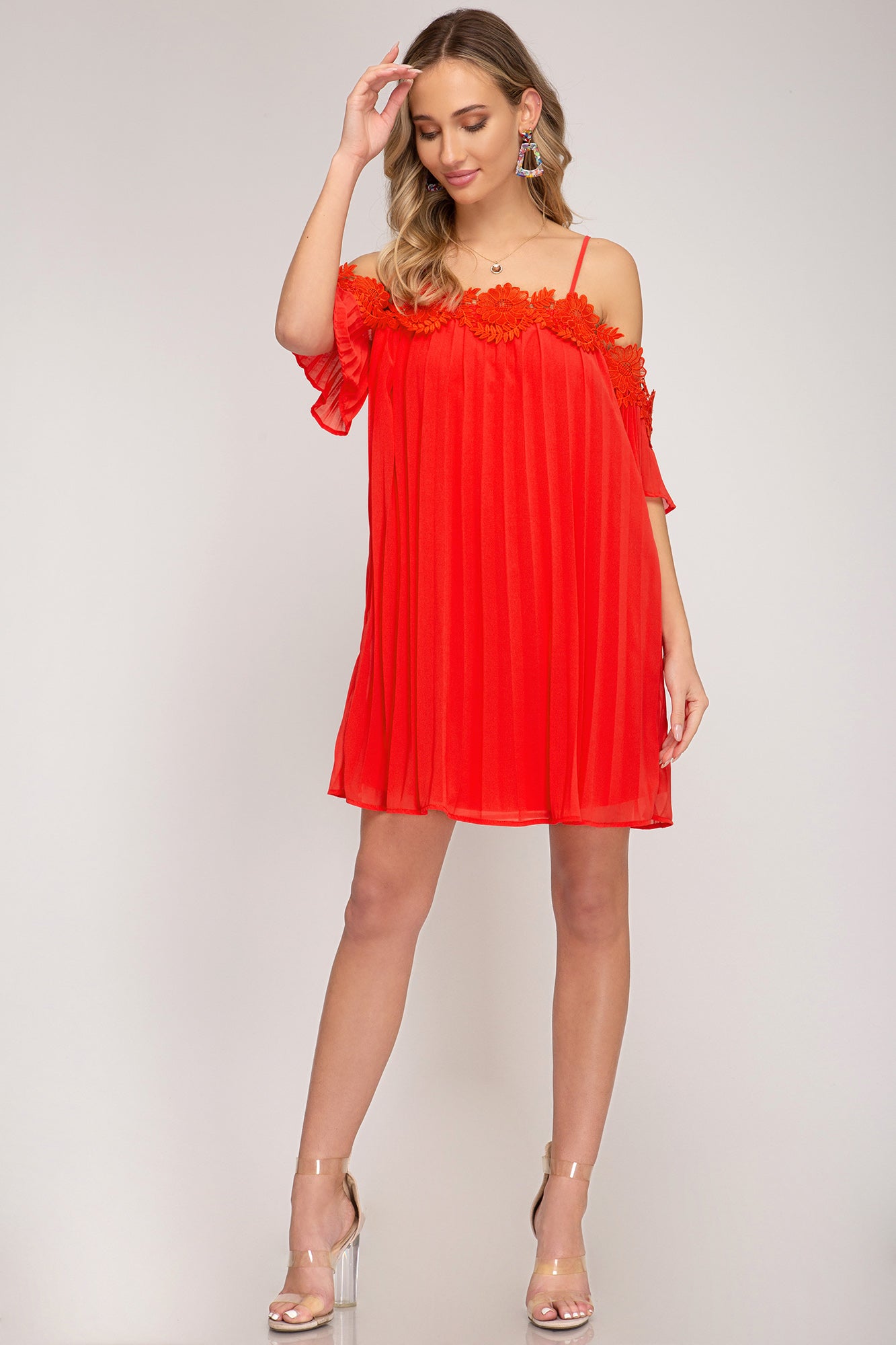 COLD SHOULDER WOVEN PLEATED DRESS WITH LACE TRIMMODEL IS 5'8"