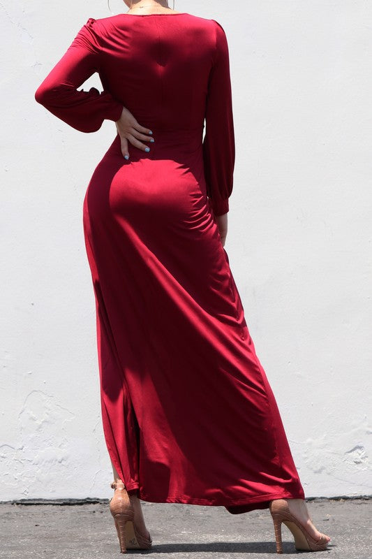 VENETIAN PUFF SLEEVES MAXI DRESS - THIGH SLIT AND DEEP V-NECK - BACK INVISIBLE ZIPPER -