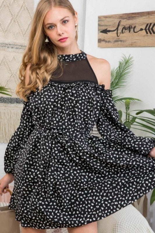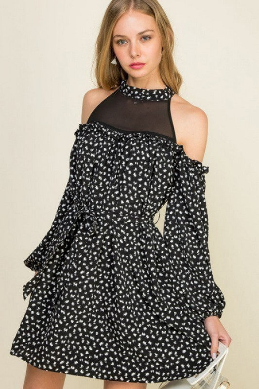 Girrrrrl, this dress is SO flattering! Round neck with tie, mesh chest, cold shoulder and elastic wristband. Waist tie and ruffles across the chest and arm, this dress has so many fun and flirty details!