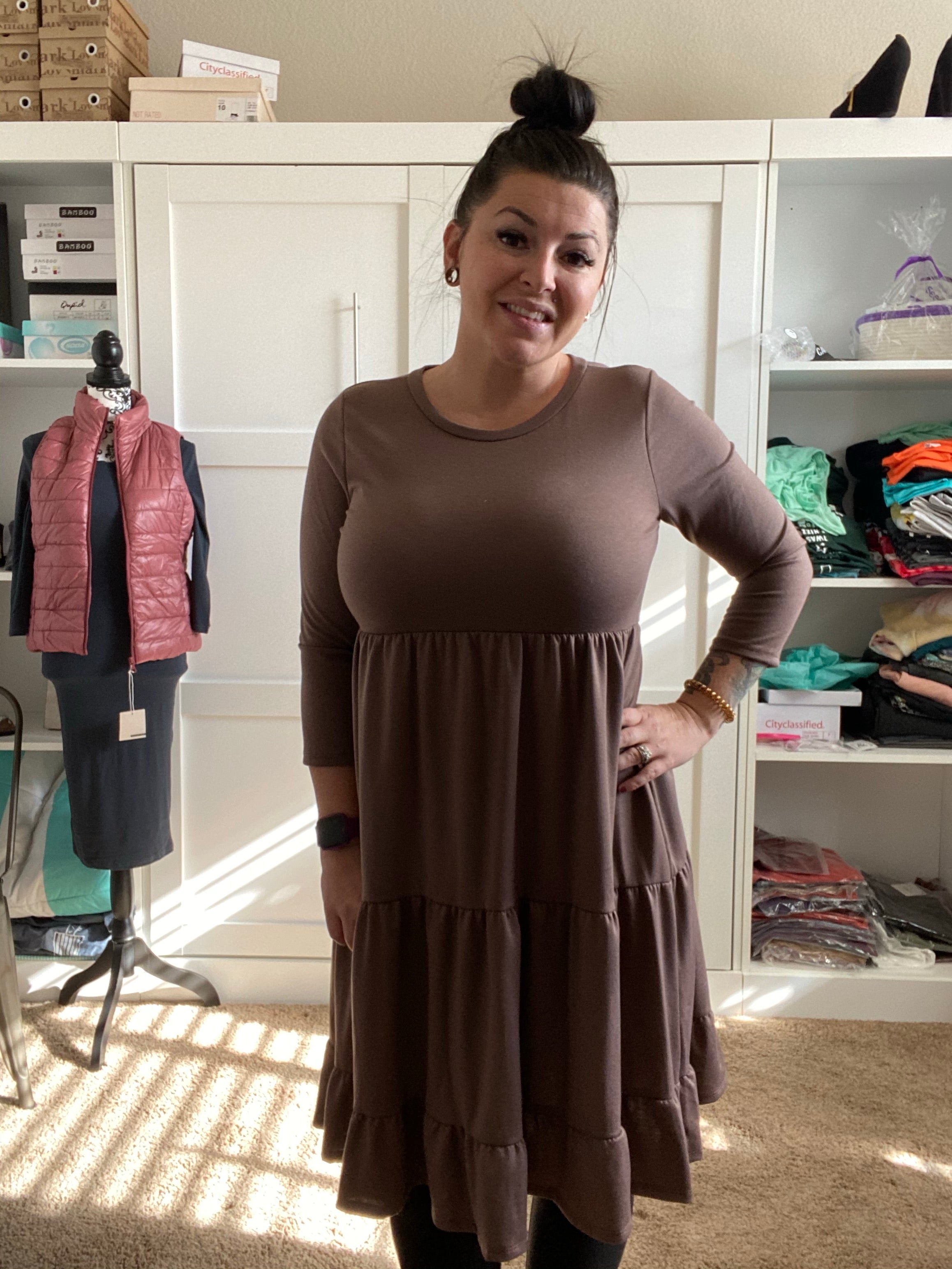 * Tiered buttery soft dress * 3/4 sleeves * Made with soft french terry fabric * Model is 5'9" wearing size SM