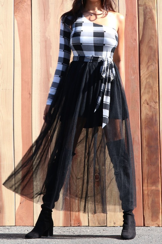 White Plaid One Shoulder Mesh Skirt Dress
