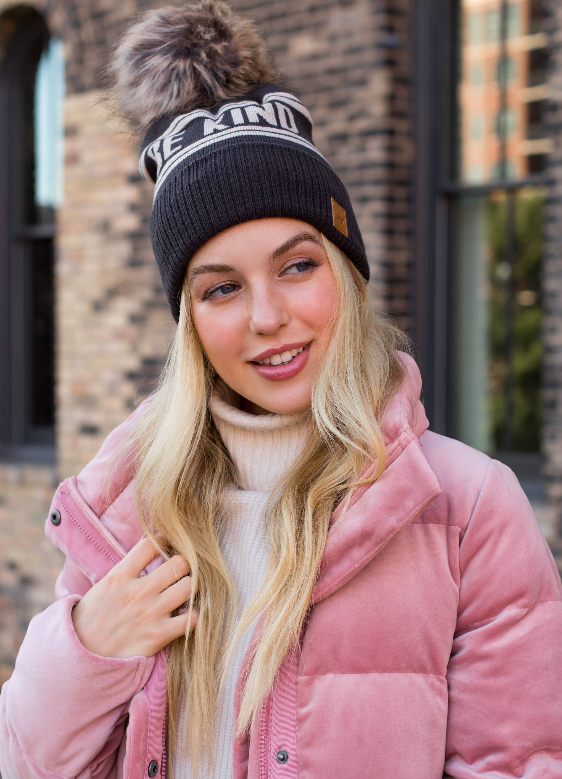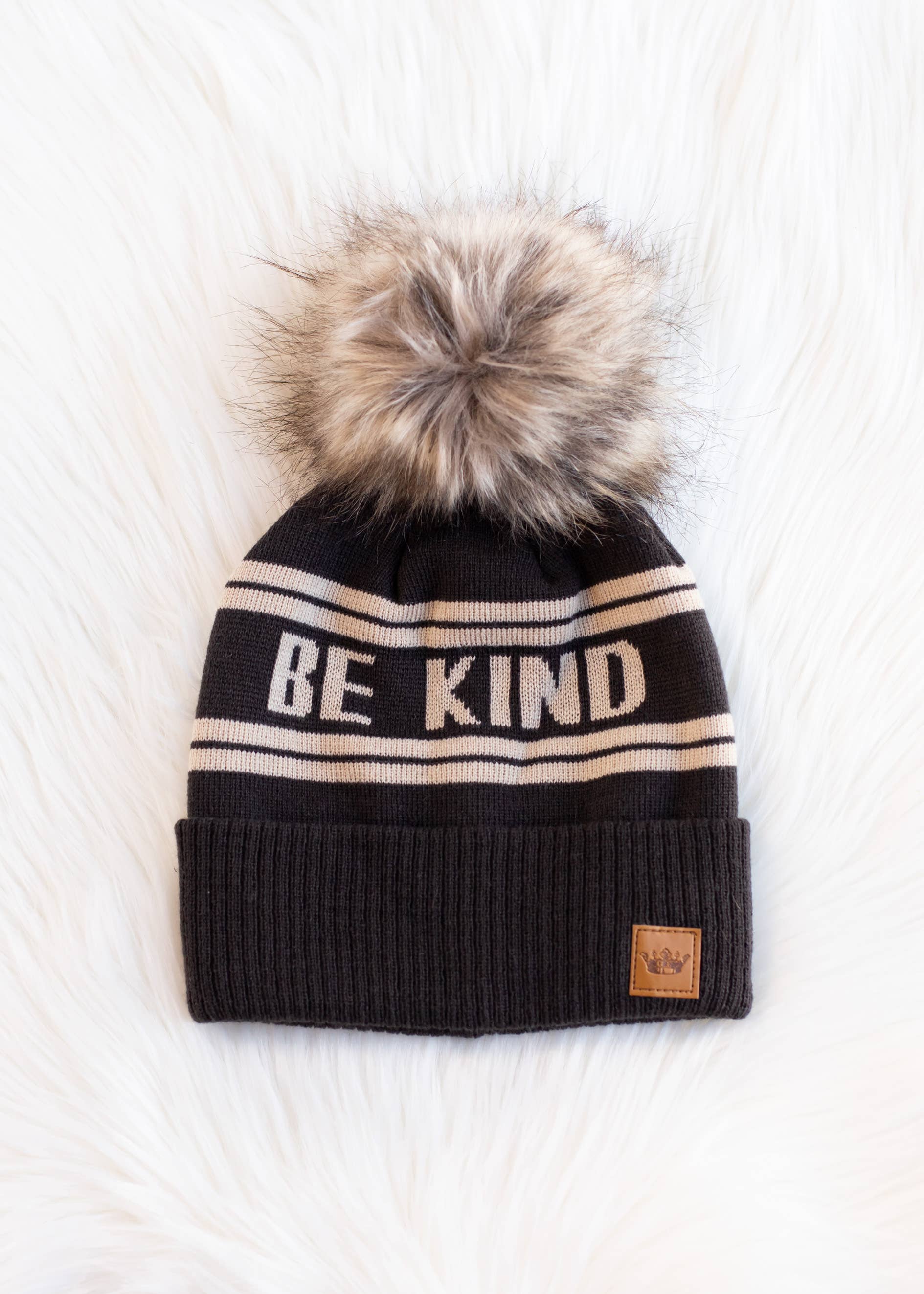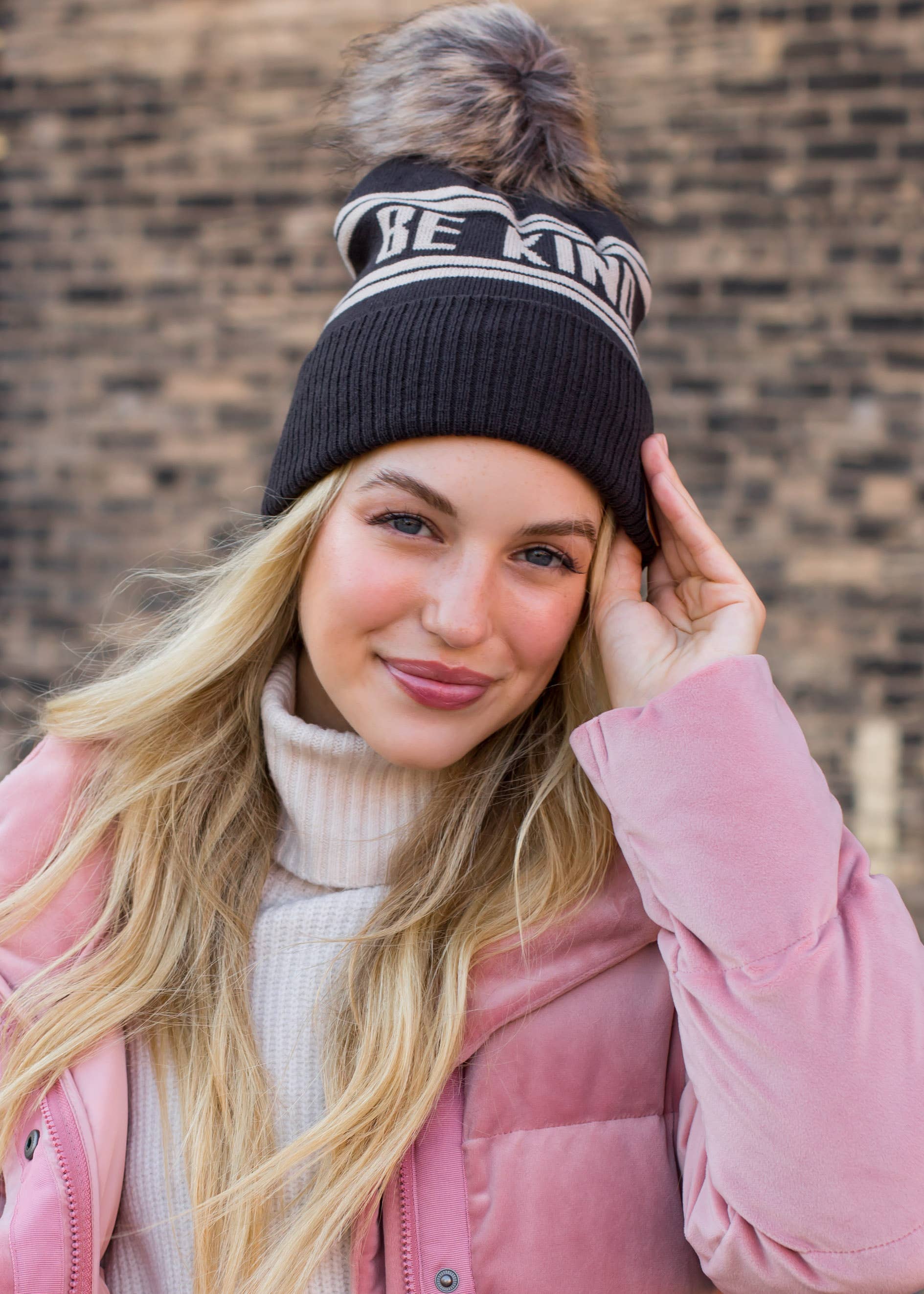 Brown & cream be kind knit hatNatural faux fur pom accent100% AcrylicMin. Qty. 2