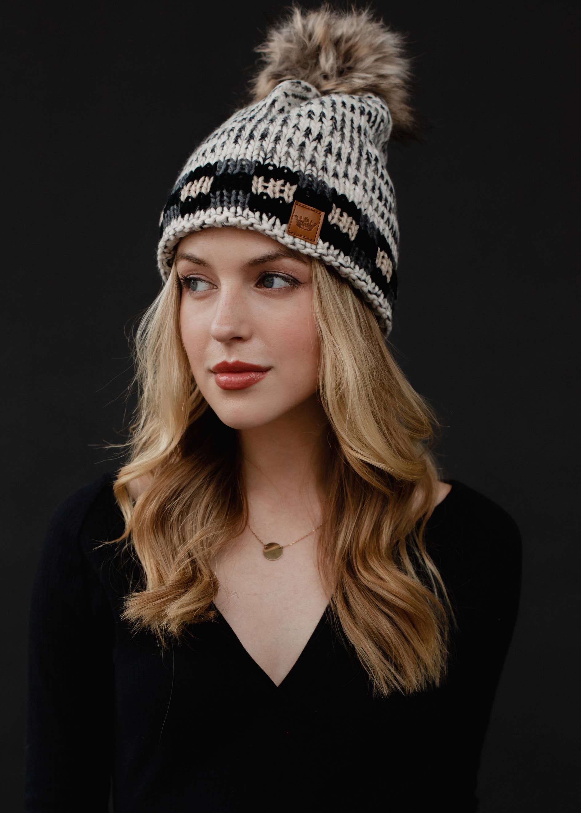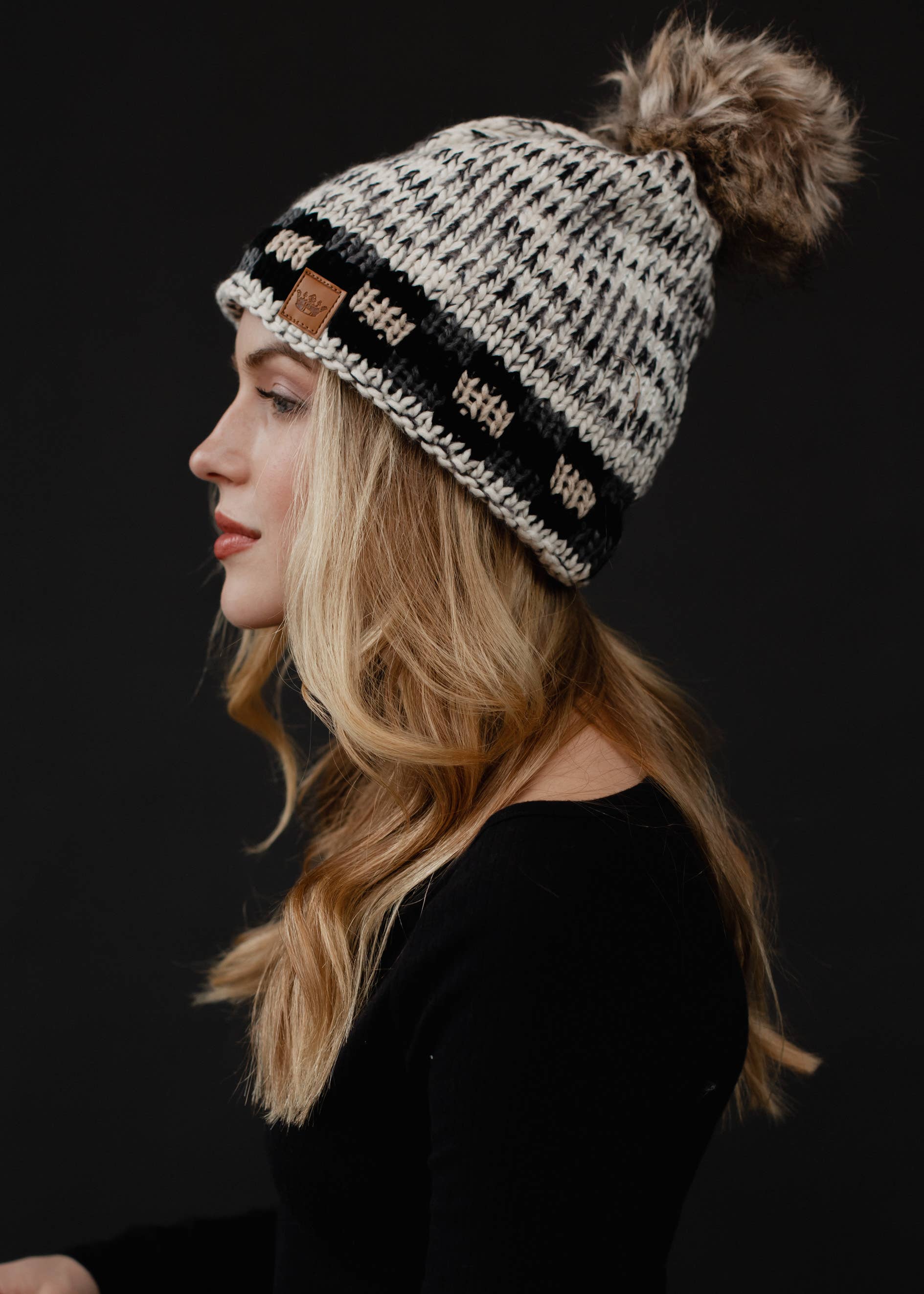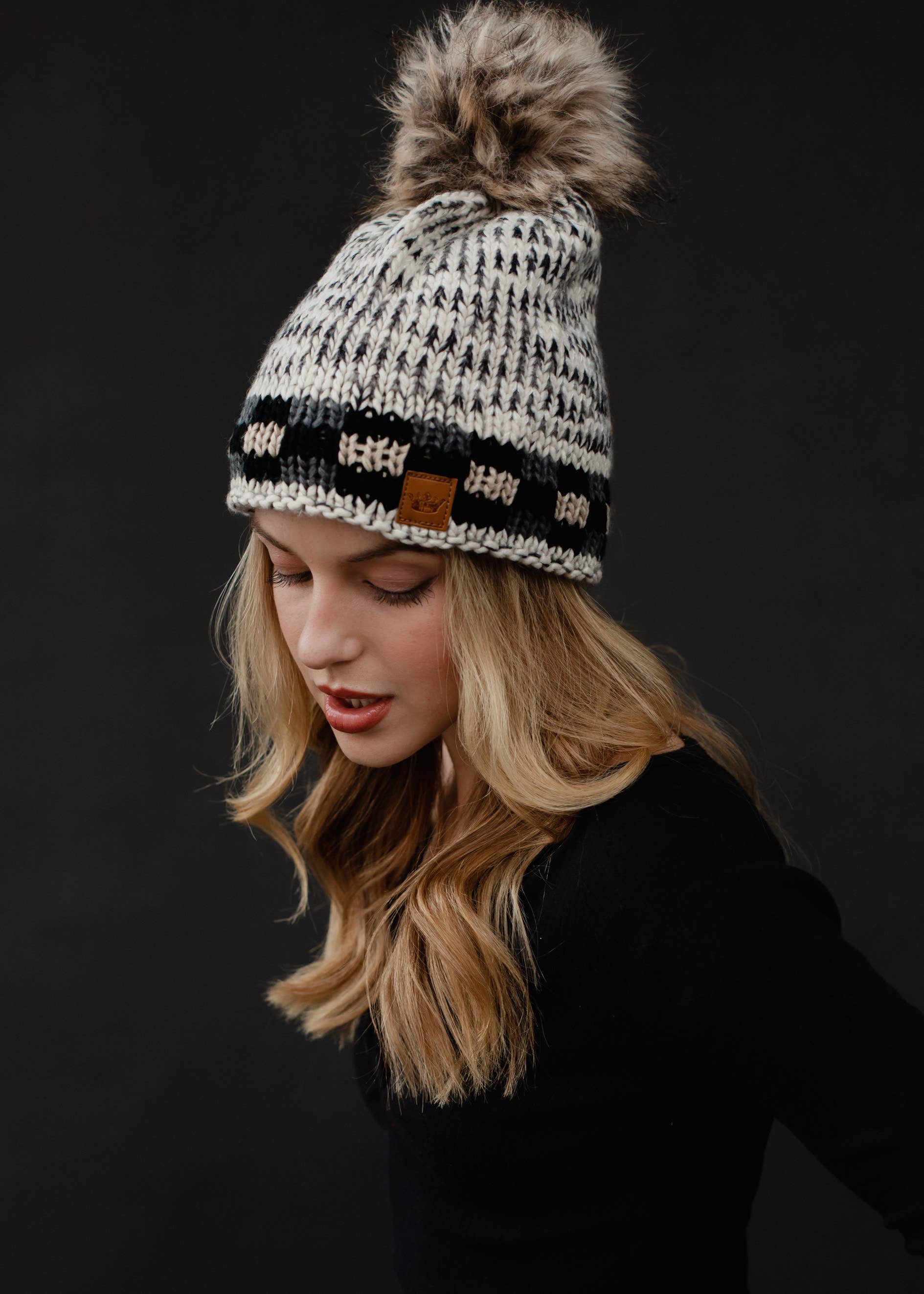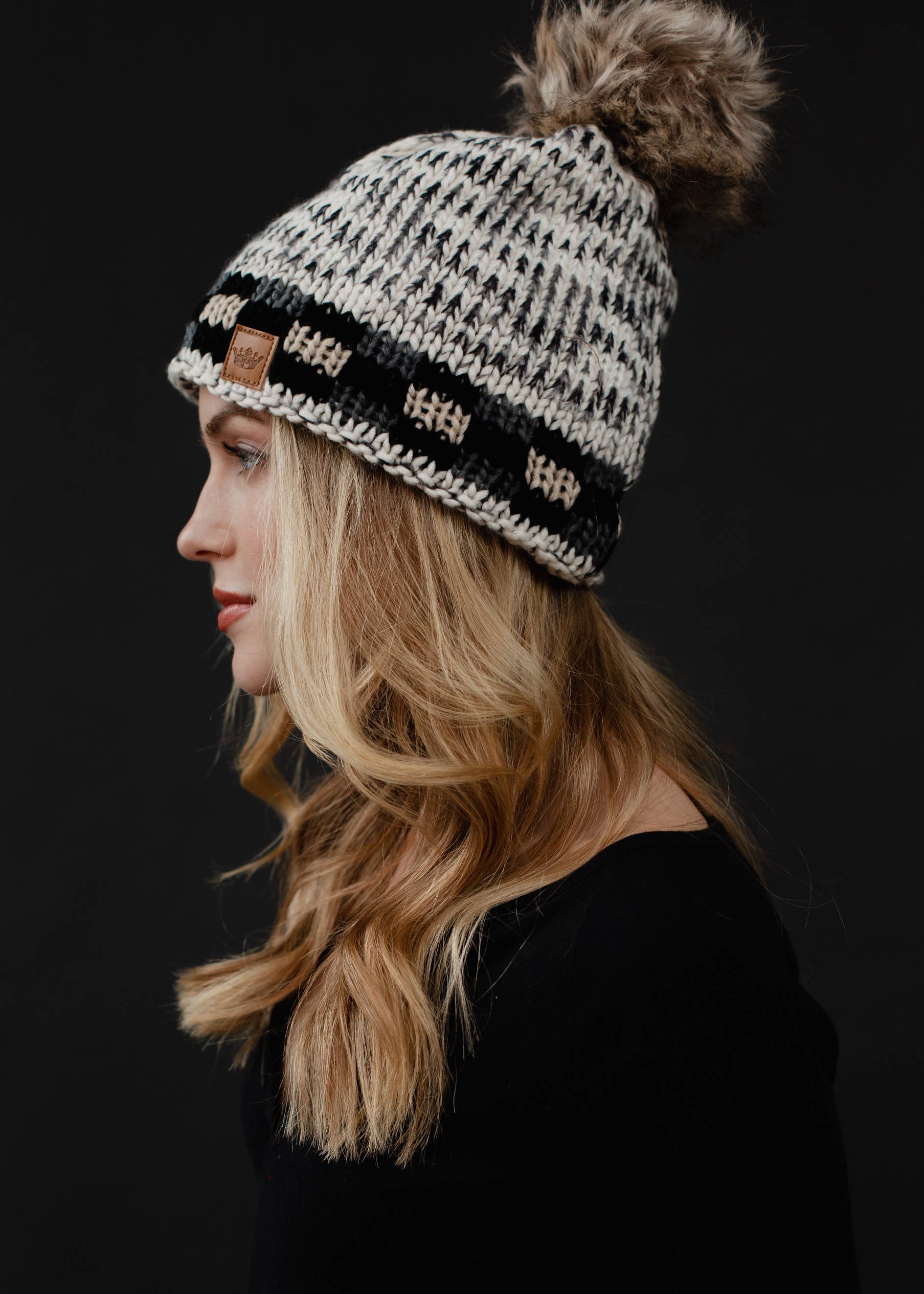 Grey heather w/ grey & tan buffalo plaid trim knit hat Fleece lined faux fur pom accent