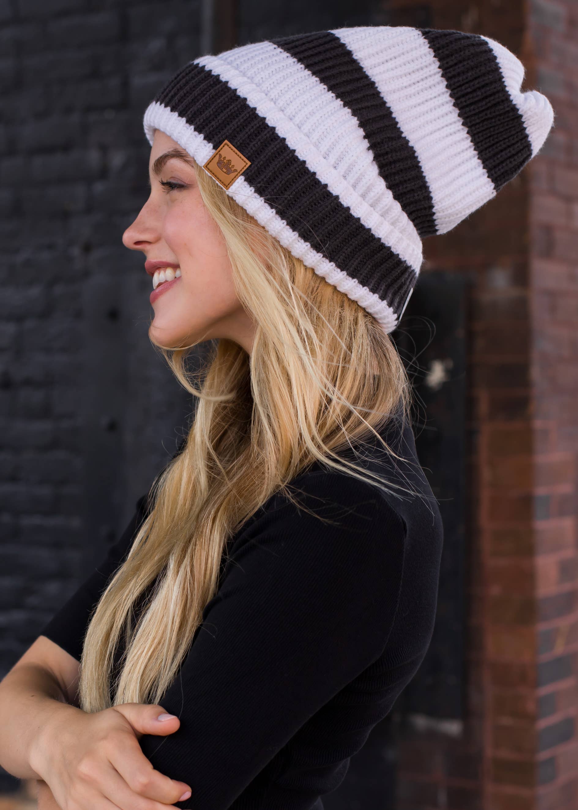 • White w/ Dark Grey Stripes Slouchy Beanie