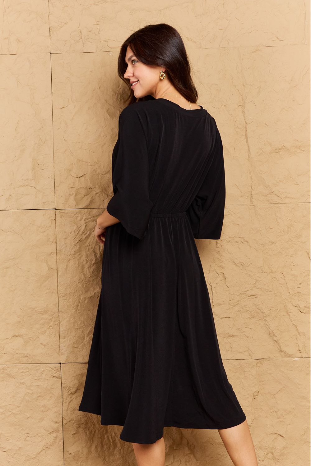 This dress is meticulously designed to enhance your figure, featuring a surplice neckline that beautifully accentuates your décolletage and a fitted waist that highlights your natural curves. TThis dress is meticulously designed to enhance your figure, featuring a surplice neckline that beautifully accentuates your décolletage and a fitted waist that highlights your natural curves. The midi length hem adds a touch of timeless elegance, falling gracefully below the knees. It strikes the perfect balance between chic and modest, making it suitable for various occasions and versatile enough for both formal and casual settings.