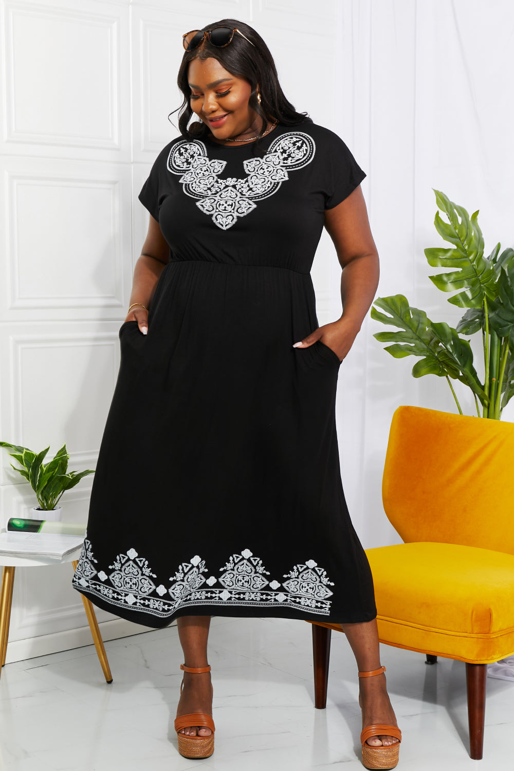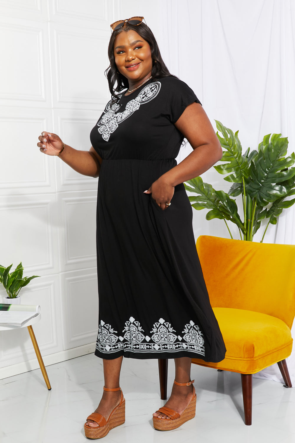 This cute dress features an elasticized waist that will flatter your figure, and a mid-calf length for a comfy and casual feel. The contrasting damask adds a tasteful detail that makes complete your outfit as easy as throwing on the dress and slipping on a pair of sandals.