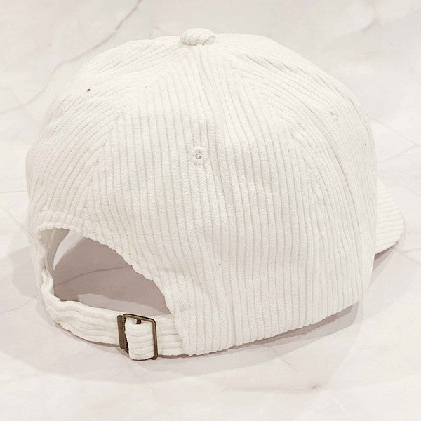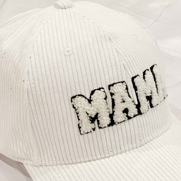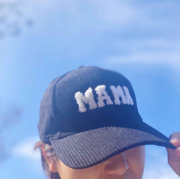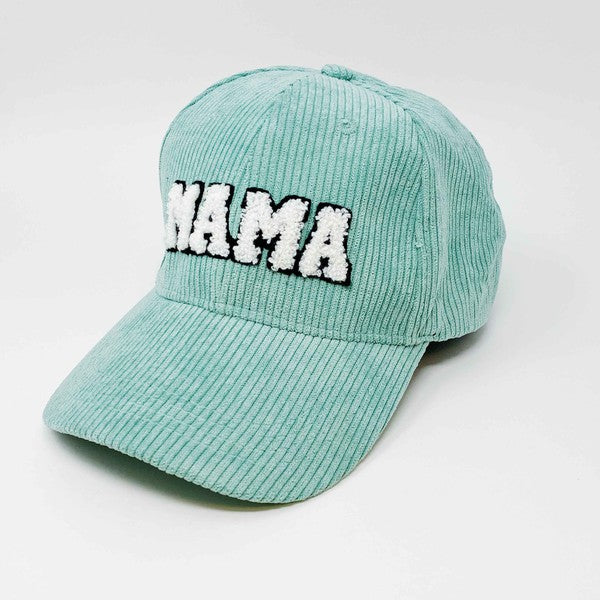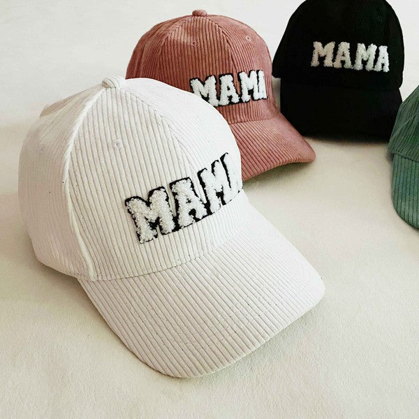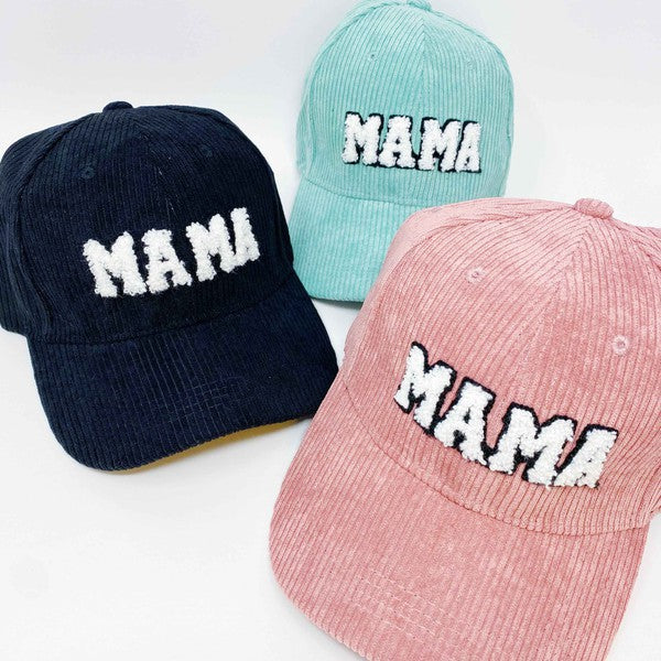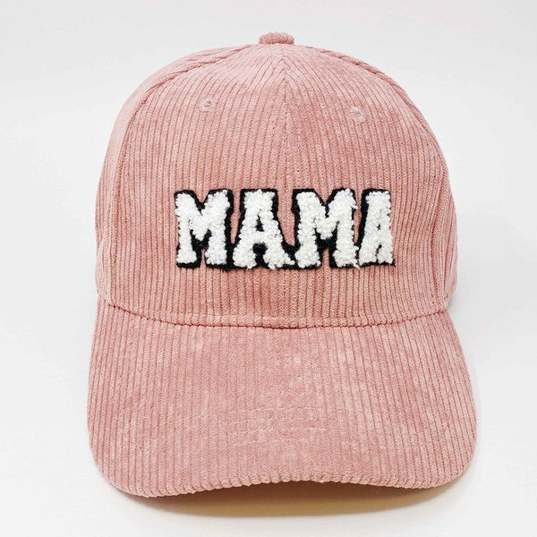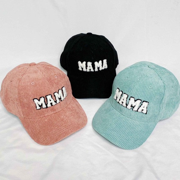Adorable corduroy MAMA ball cap with fuzzy patch lettering! Has great fit with perfect curved brim. Clip closure on the back to adjust size and hidden pocket for seamless look. Great details all around.